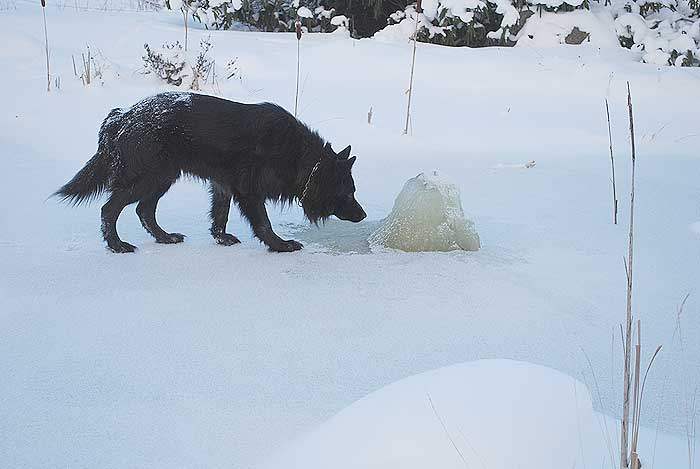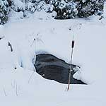 Igår var det islossning i dammen, minst en månad senare än förra året. Trots